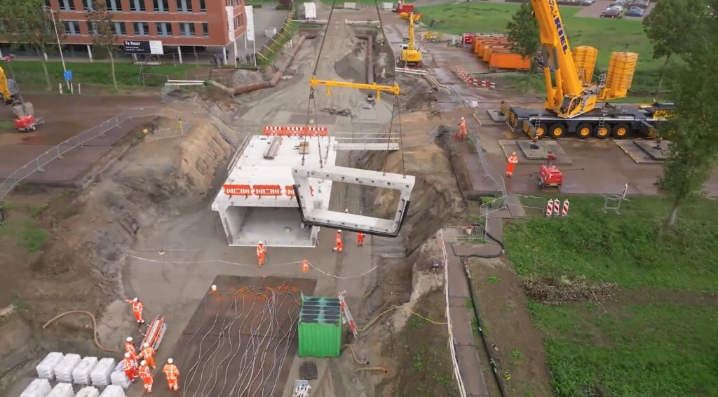 Afgelopen week is het gesloten, ondergrondse deel van de fietstunnel aangelegd. Het verharde wegdek van de N322 is verwijderd, de grondwerkzaamheden zijn uitgevoerd, de prefab tunnelelementen gemonteerd en het wegdek is hersteld.