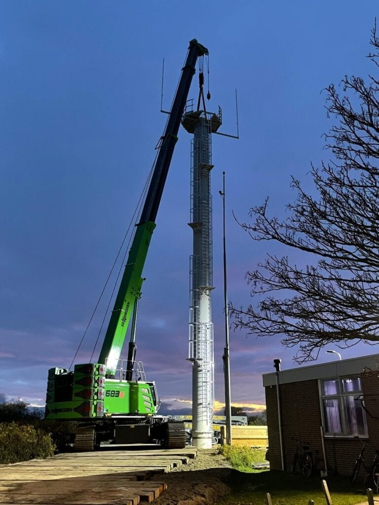 Gelukkig was het nagenoeg windstil. Perfecte weersomstandigheden om de RDF-mast veilig en beheerst te kunnen hijsen.
